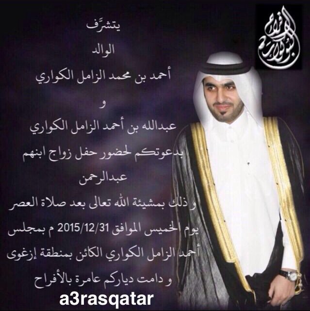 خالد سعدون الكواري On Twitter يتشرف السيد سعدون بن ارحمه بن احمد الجهام الكواري بدعوتكم لحضور حفل زواج ابنه خالد وذلك بمشئة الله تع Http T Co 4spv1kjr